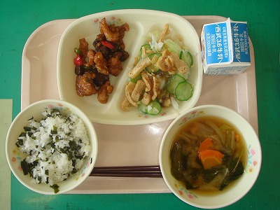 7月4日(月)の給食☆本日の献立☆ わかめご飯、鶏肉とレバーのオレンジソース、みそ汁、ぱりぱりサラダ ぱりぱりサラダは、油揚げの揚げたものが入っていて、それがぱりぱりという食感なので名前がついたようです。 |