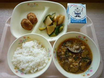 (メニュー) マーボーナス豆腐 白ごまつくね ペッパーキュウリ ご飯 牛乳 (食レポ) ナスもキュウリ夏の野菜と言っていいでしょう。 ナスは大きく切ってあり、存在感があります。 低学年には少し辛いかもしれませんが 個人的には辛いのが好きです。 |