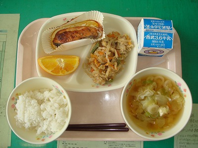 ご飯、鮭のめんたいマヨネーズ焼き、切り干し大根炒り煮、みそ汁 今日は純和風の献立でした。めんたい味の焼き鮭、子どもたちも大好きです。 |