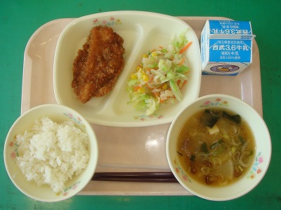 7月11日(月)の給食☆本日の献立☆ カレー風味カツ、なめこ汁、キャベツのサラダ 暑くて食欲がないときは、カレー味がうれしいですね。食欲が増します。カツにはたれがかかっているので、カツ丼のようにして食べている子もいました。 |