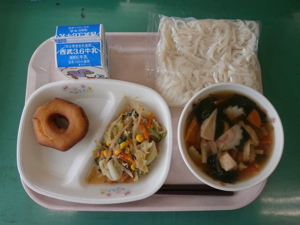 牛乳、五目うどん、卵ドーナツ 野菜とじゃこの炒り煮