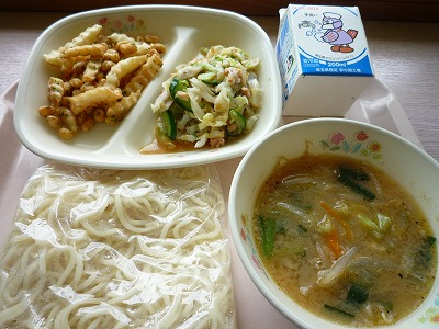 (メニュー) ごま味噌ラーメン 大豆とポテト揚げ ヘルシーサラダ 牛乳 (食レポ) サラダにはツナが入っています。 大豆とポテト揚げは、塩分がおさえられています。 ラーメンのつゆには、豚肉やニンニク、生姜も入っています。 |