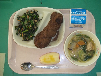 12月11日(火)の給食☆本日の献立☆ ココアあげパン、ほうれん草とひじきのサラダ、白菜と肉団子のスープ、リンゴ 冬野菜の定番白菜と、ふんわりと丸められた肉団子がベストマッチで、とてもおいしかったです。家なら、鍋を囲んでいる風景でしょうね。 |