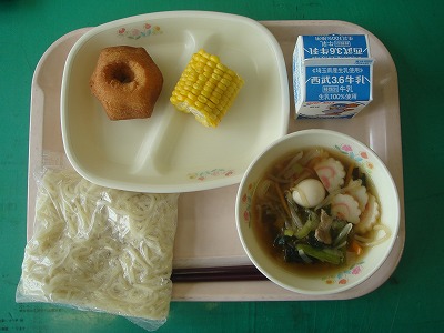 6月30日(木)の給食☆本日の献立☆ しょうゆラーメン、たまごドーナツ、ゆでとうもろこし 具がたっぷりのラーメンでした。とうもろこしは、1年生が皮むきをしたものです。おいしくいただきました。 |
