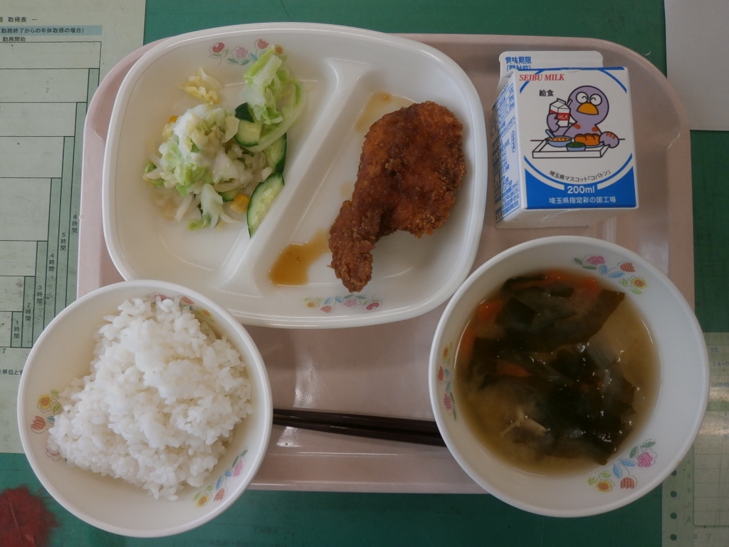 ☆今日の献立☆  牛乳 ごはん 手作りチキンカツ あさりと豆腐のみそ汁 たくあんサラダ 今日は1年生の保護者対象の給食試食会でした。 調理員さんの愛情たっぷりチキンカツを提供しました。 たくあんサラダが意外性があっておいしかったとの 感想をいただきました。