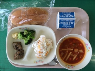 ☆今日の献立☆  牛乳、フルーツクリームサンド ひじき入りつくね、茹でブロッコリー ミネストローネ 平成27年度の給食も始まりまりました。 今年度もおいしい給食で、子どもたちに 楽しい時間が提供できるように がんばりたいと思います。