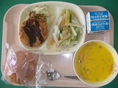 7月11日(火)の給食☆本日の献立☆ パン、ハムカツ、スティック野菜、パンプキンスープ 昨日に続いて今日もカツ。野菜もたっぷりで、体によいメニューです。完食して、今日も暑さに負けず頑張ろう! |