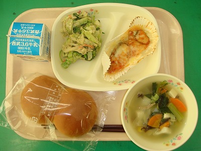 11月29日(火)の給食☆本日の献立☆ はちみつパン、白身魚のピザ風、野菜の胡麻マヨ和え、豆腐と野菜のコンソメスープ 白身魚のピザ風、白身魚の淡泊な味とピザ風味のトッピングがよく合い、とてもおいしかったです。家庭でも簡単にできそうですね。 |
