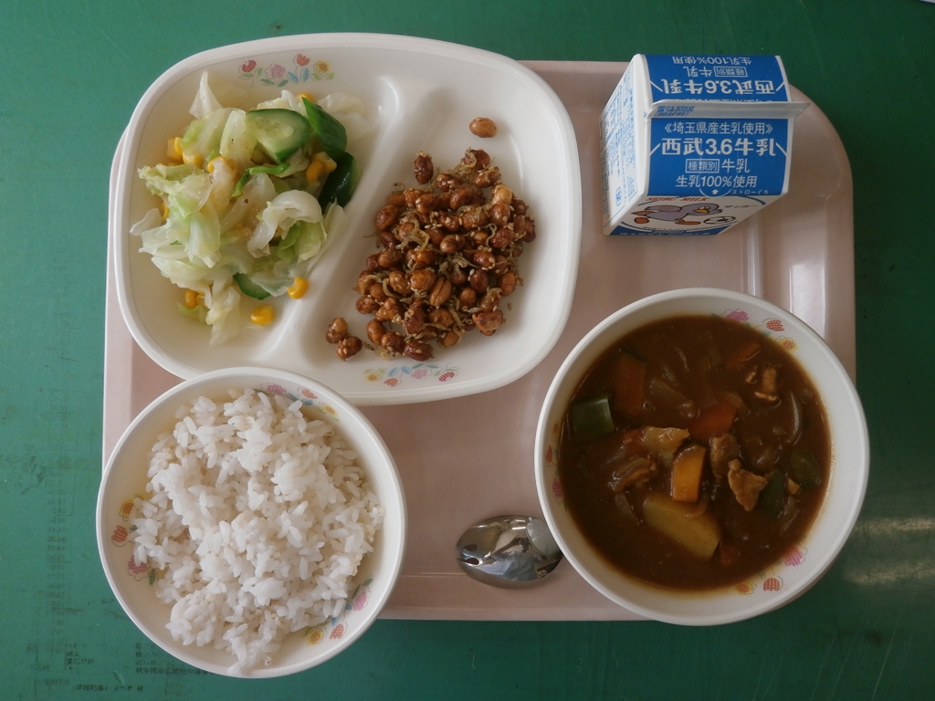 今日は、初めて牛乳の残りがゼロでした。 大豆にはちりめんじゃこもたっぷり入り カルシウムアップメニューになりました。 大豆は、かたくり粉をまぶし20分から30分かけて かりかりに揚げています。 カレーライスはよくかまずに食べてしまう子が多いため かりかりの大豆が定番のカレーの日メニューです。 夏野菜は、なす、カボチャ、ピーマンを入れました。 なすは黒くなってしまいがちですが、色よく仕上がりました。