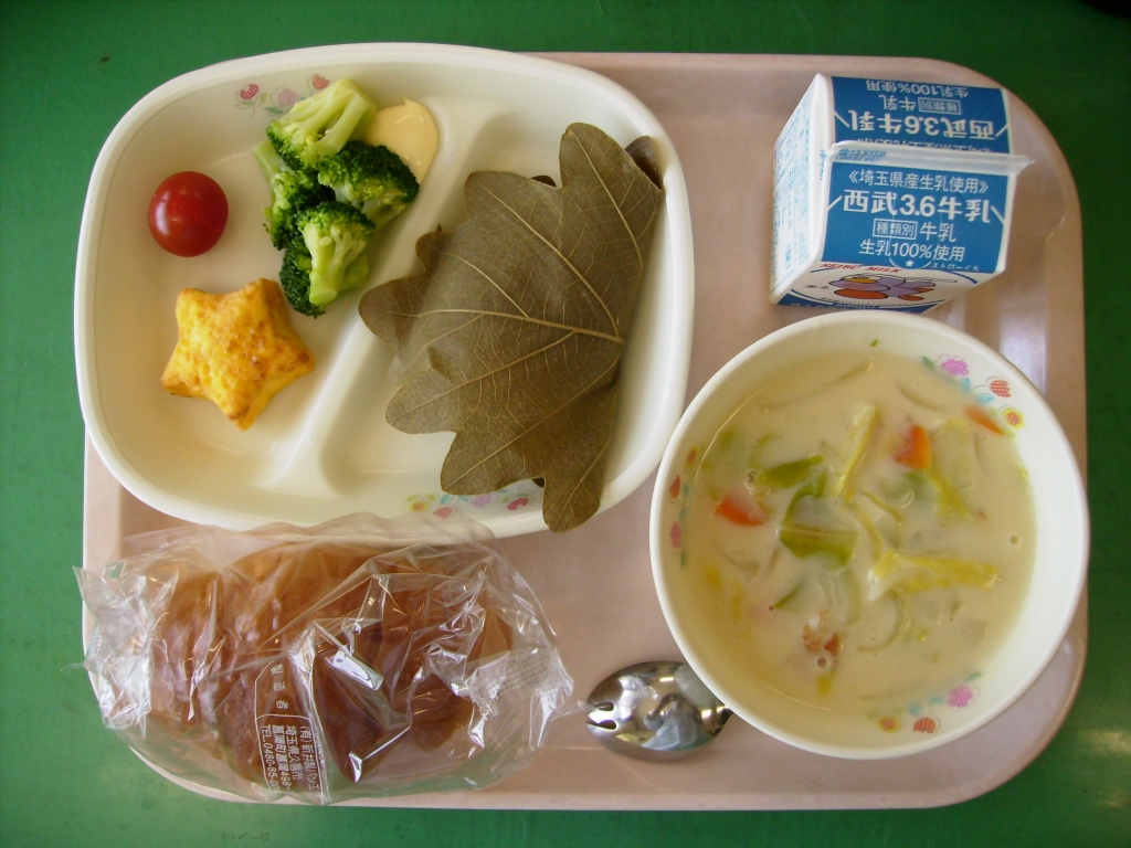 牛乳、バターロール、クラムチャウダー 星形オムレツ、野菜の付け合わせ 柏もち