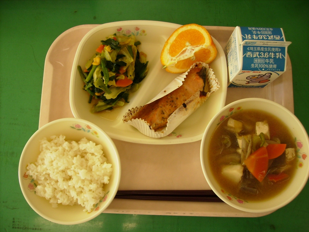 ☆今日の献立☆  牛乳、ごはん、けんちん汁 鮭の味噌マヨネーズ焼き ほうれん草のカレー風味炒め いよかん 今日は鮭の味噌マヨネーズ焼きが自動に好評でした。 味噌とマヨネーズ、粉チーズを加えてソースを作り カップに並べた鮭にかけてオーブンで焼きました。 パセリを上からかけて、彩りもよく仕上がりました。