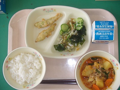 6月15日(木)の給食☆本日の献立☆ ご飯、じゃが豚キムチ、ワカサギのフリッター、海藻サラダ じゃが豚キムチが、とても甘かったです。子ども向けに甘い味付けなのか、ジャガイモの甘さなのか、豚肉の脂の甘さなのか…もっと辛いのを想像していたのですが、不思議な感じでした。 |