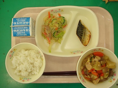 1月13日(金)の給食☆本日の献立☆ ご飯、サバの塩焼き、大根と鶏肉の煮込み、中華サラダ 青み魚は苦手な人が多いようですが、栄養たっぷりなので、給食ではしっかり食べて欲しいです。皮はパリッと、身はふっくらととてもおいしく焼けていました。 |