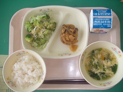 9月7日(金)の給食☆本日の献立☆ ご飯、和風ハンバーグ、グリーンサラダ、ニラと卵のスープ ニラに、グリーンサラダ。運動会の練習で疲れた体に、ビタミンたっぷりのメニューでした。ハンバーグで力もつきそうです。 |