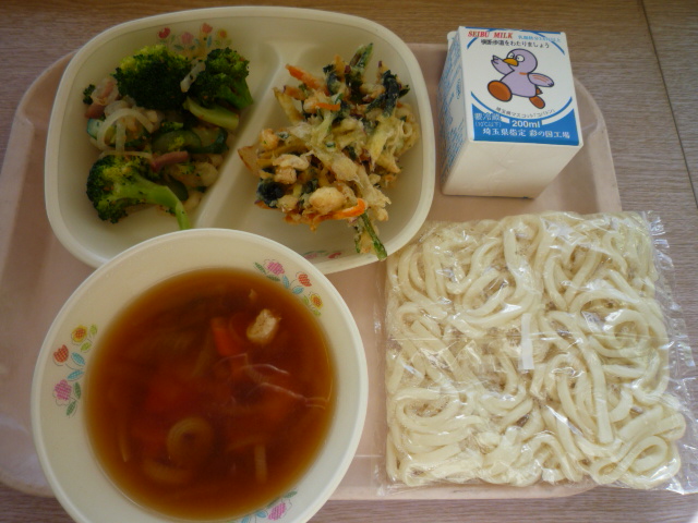 (献立) かきあげうどん(ほうれん草のかきあげ) ブロッコリーサラダ 牛乳 (コメント) かきあげには、大豆やさくらえび、あさりなども入って いました。サクサクとしていて、そのまま食べてもつゆに 入れて食べても美味しいです。 |