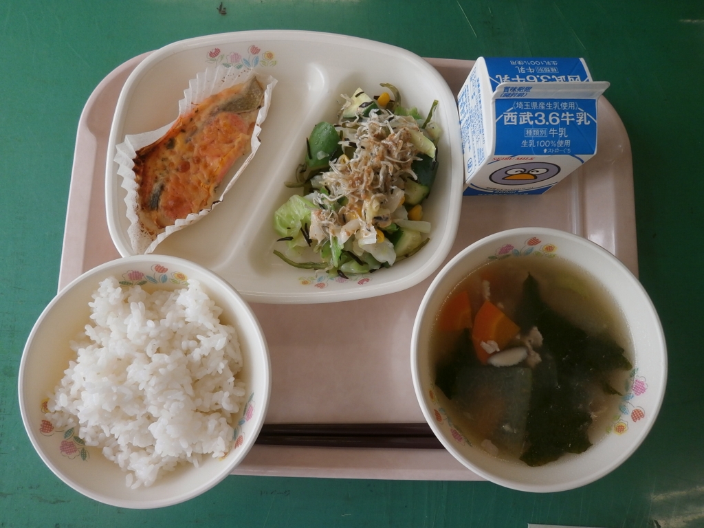 牛乳、ごはん、冬瓜のスープ 鮭のめんたいチーズ焼き、海草サラダ(じゃこ入り)