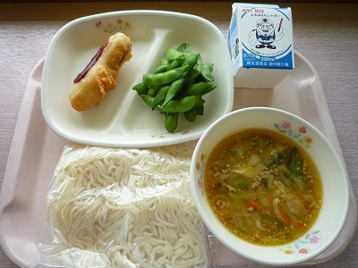 (メニュー) 担々麺 アメリカンドッグ 枝豆 チーズ 牛乳 (食レポ) お店やカップで食べる担々麺は、茶色をしていることが多いですが、 学校の担々麺は、それほど濃い色はしていません。ラー油と豆板醤で 味付けをしていますが、1年生も食べられる辛さです。 |