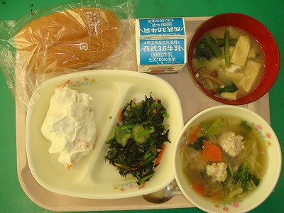 12月13日(火)の給食☆本日の献立☆ パン、フルーツクリームサンドの具、ほうれん草とひじきのサラダ、白菜と肉団子のスープ フルーツクリームサンド、子どもたちが大好きなメニューです。口いっぱいにほおばって食べる姿が想像されます。右上のみそ汁は、5年生が調理実習で作ったみそ汁です。味見用に持って来てくれました。ジャガイモがとろけるように煮込んであり、味付けも上手で、とてもおいしくいただきました。 |