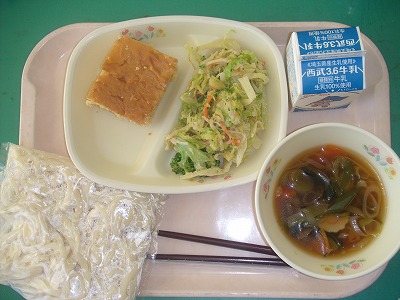 1月26日(金)の給食☆本日の献立☆ 地粉うどん、深谷ネギたっぷりうどんの汁、黒糖パンケーキ、冬野菜の胡麻マヨ和え 深谷ネギたっぷりうどん。確かにネギがたっぷり入っていました。冬野菜の胡麻マヨ和えと共に、風邪を吹き飛ばしてくれそうなメニューでした。 |