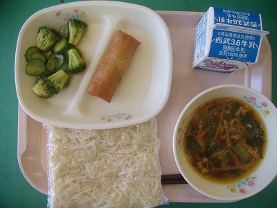 9月8日(金)の給食☆本日の献立☆ ラーメン、広東麺の汁、春巻き、温野菜 子ども達は運動会の練習でばて気味でしょうか?こういう時は、のどごしのよい面が嬉しいですね。春巻きもパリッと揚がっていて、おいしかったです。 |
