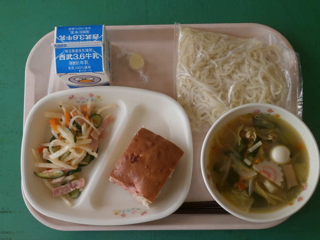 今日は野菜をたっぷり使ったタンメンでした。 塩味のさっぱりした仕上がりになりました。 きゅうりと大根の中華和えは、今月の新メニューでした。 千切りにしたにんじん、きゅうり、大根、ハムをとうがらし ラー油を入れた、ピリ辛のドレッシングで和えました。 いちごパンケーキは、スライスいちごをたっぷりといれ マーブル状にして、オーブンで焼きました。
