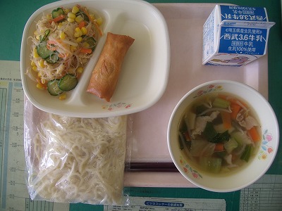 3月7日(水)の給食☆本日の献立☆ 中華麺、タンメンスープ、春巻き、中華サラダ いつものように、春巻きの皮はパリッと、中華サラダの春雨は程よい固さと…できたてが食べられる自校給食の味と食感を楽しんでいます。 |