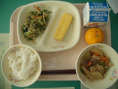 12月7日(木)の給食☆本日の献立☆ ご飯、大根と豚肉の煮込み、厚焼き卵、磯の香和え、みかん おかかの入った和え物は、子どもの頃食べた記憶は無いのですが、何となくお袋の味に感じてしまいます。それぞれのご家庭では、作ったりしますか? |