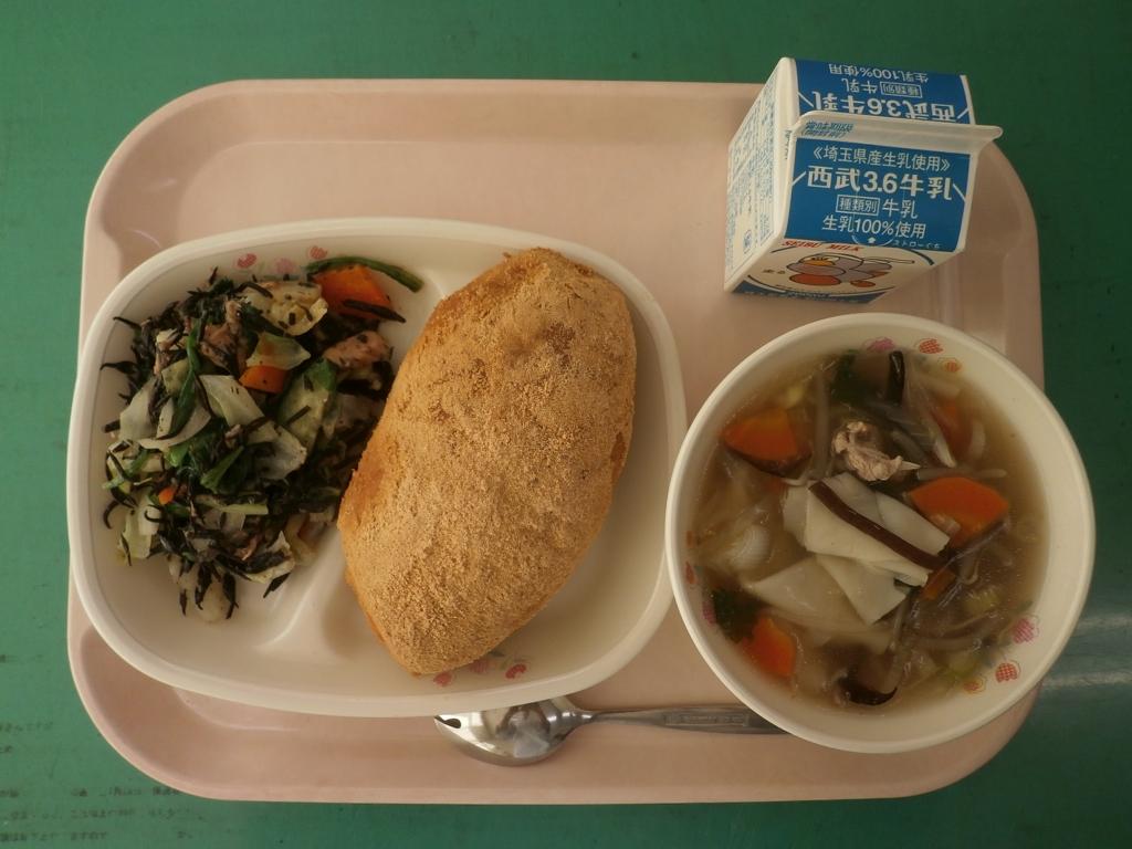 ☆今日の献立☆ 牛乳、きなこあげぱん、わんたんスープ ほうれん草とひじきのサラダ今日は、久しぶりの揚げパンでした。給食室でかりっと揚げて きな粉、砂糖、少しの塩を混ぜた粉をかけます。 どのクラスも、欠席が多かったのですが残りはありませんでした。 わんたんスープもサラダもたっぷりでしたが、よく食べました。 子どもたちからは、揚げパンおいしかった! スープもおいしかった、 また出して~と笑顔で給食室に来てくれました。