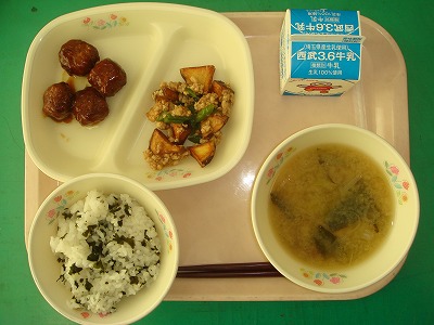 11月17日(木)の給食☆本日の献立☆ わかめご飯、ミートボール、さつまいものそぼろあん、なめこ汁 最近の子どもは、ふりかけや混ぜご飯があまり好きではないと聞いたことがありますが、榛沢小の子どもたちはどうなのでしょう?わかめご飯は美味しいと思いますが… |