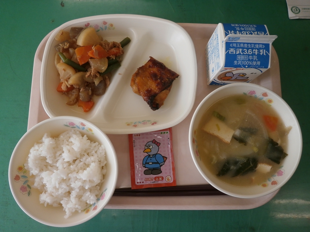 牛乳、ごはん、野菜椀 スパイシー照り焼きチキン 大根とツナの煮物 ふりかけ