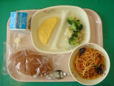 7月12日(火)の給食☆本日の献立☆ 黒パン、FUKAYAの和風ボロネーゼ、オムレツ、花野菜のサラダ 今日はボリュームたっぷりでした。黒パンにスパゲティ…主食が2品出たような感じです。高学年の男子は大喜びでしょうが… |