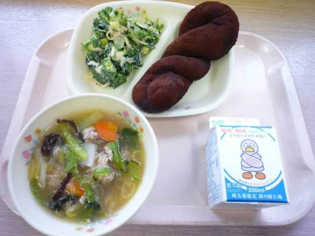 (献立) ココア揚げパン 白菜と肉団子のスープ 冬野菜のごまマヨネーズ和え 牛乳 (コメント) スープ、コクがあって美味しいです。今日は冷え込んでいます ので、スープはありがたいです。 先日、NHKテレビ「ためしてガッテン」の白菜特集をご覧にな りましたか。煮る、焼く、炒めるなど料理によって「切り方」を 変えることが料理のポイントらしいです。 また、ごまマヨネーズ和えも栄養たっぷりで美味です。 |