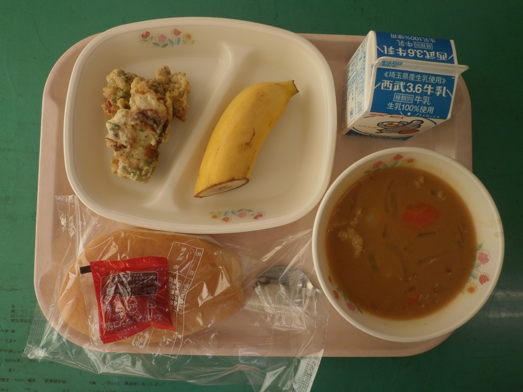 ☆今日の献立☆ 牛乳、コッペパン、イチゴジャム ちくわの磯辺揚げ、バナナ カレーシチュー