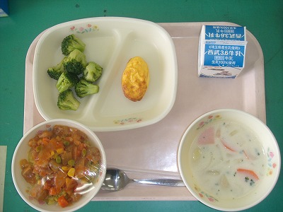 1月24日(水)の給食☆本日の献立☆ ジャンバラヤ(ご飯)、オムレツ、ゆでブロッコリー、花豆のポタージュ 今日のご飯は、見た目はカレーピラフのようですが、ジャンバラヤです。ジャンバラヤには鶏肉も入っていますし、ゆでブロッコリーや野菜たっぷりのポタージュと、バランスのよいメニューでした。 |