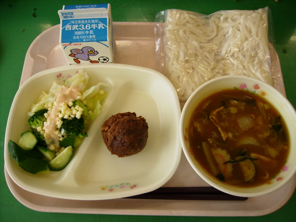 今日の献立  牛乳、カレーうどん サーターアンダギー、チーズサラダ 今日は、サーターアンダギーを提供しました。 給食室でひとつずつ丸めて、低温でじっくりと揚げました。 外側はカリカリ、中はふわっとしていておいしかったです。 カレーうどんには、はんのき学級より届いた、 長なす2本とピーマン1個を入れて仕上げました。 なすとピーマンが入っていたら「あたり」です。 チーズサラダも児童には好評でした。 めんが少し余りましたが、どのクラスもおかずは残りなし!! 今日もよく食べました♪ |
