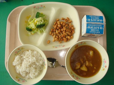 10月21日(金)の給食☆本日の献立☆ ご飯、ポークカレー、三色サラダ、大豆のカリカリ揚げ 肉もジャガイモもごろごろ入っていて、ちょっと贅沢な感じのカレーでした。大豆もカリッと揚がっていて、歯ごたえも食べごたえもありました。 |