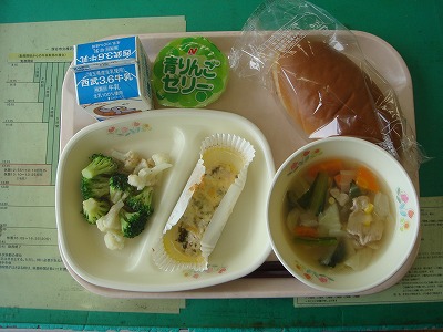 5月24日(火)の給食☆本日の献立☆ 黒パン、チキンの香味焼き、温野菜、野菜コンソメスープ、青リンゴゼリー 今日のような暑い日には、さっぱりさわやかなゼリーがうれしいですね。 |