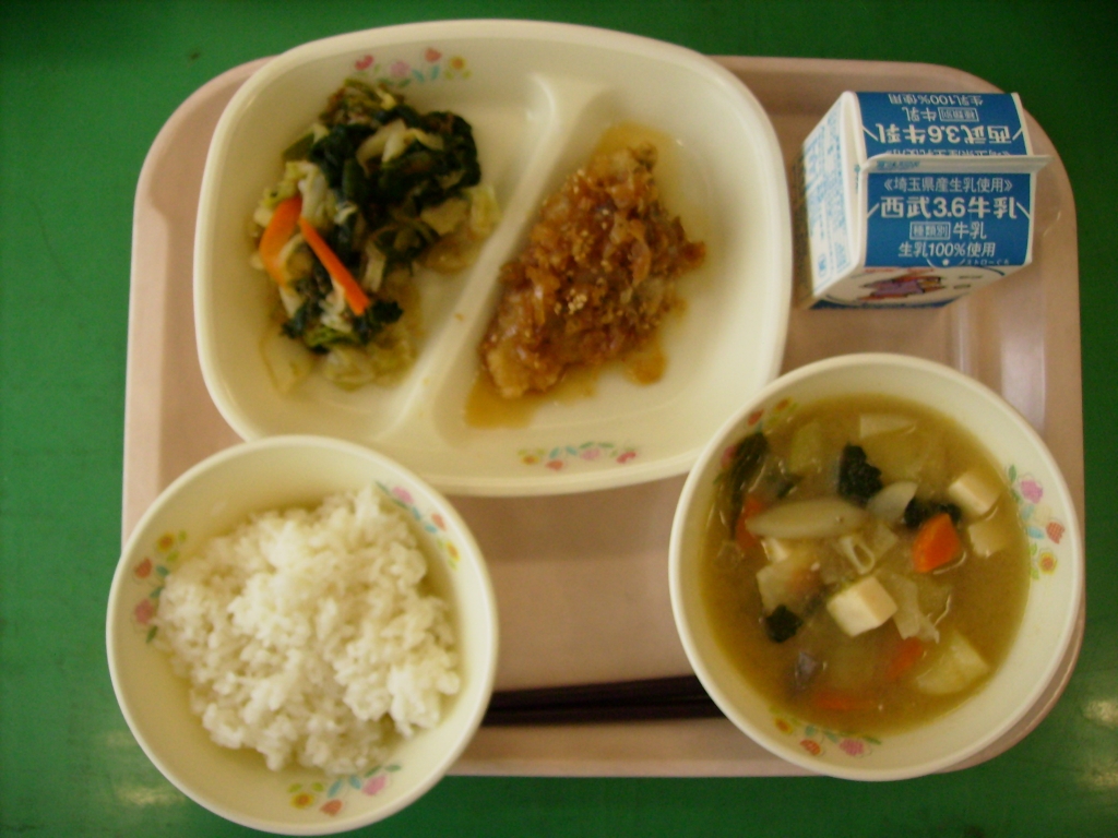 今日の献立  牛乳、ごはん、野菜椀 白身魚の南蛮漬け、煮びたし 今日はたらに片栗粉をまぶし、油で揚げ、 南蛮だれを上からかけて、南蛮漬けを提供しました。 蒸し暑い日々が続いています。唐辛子などのスパイスや お酢を使ったメニューでさっぱりと食べられる様に工夫しています。 たらは、身が柔らかくておいしかったです。