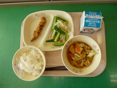 10月30日(月)の給食☆本日の献立☆ ご飯、生揚げのチャオサイ、ししゃもフリッター、スティック野菜 教頭:生揚げのチャオサイの味噌味は、家庭で作れるような料理ではないので、とてもおいしかったです。 |