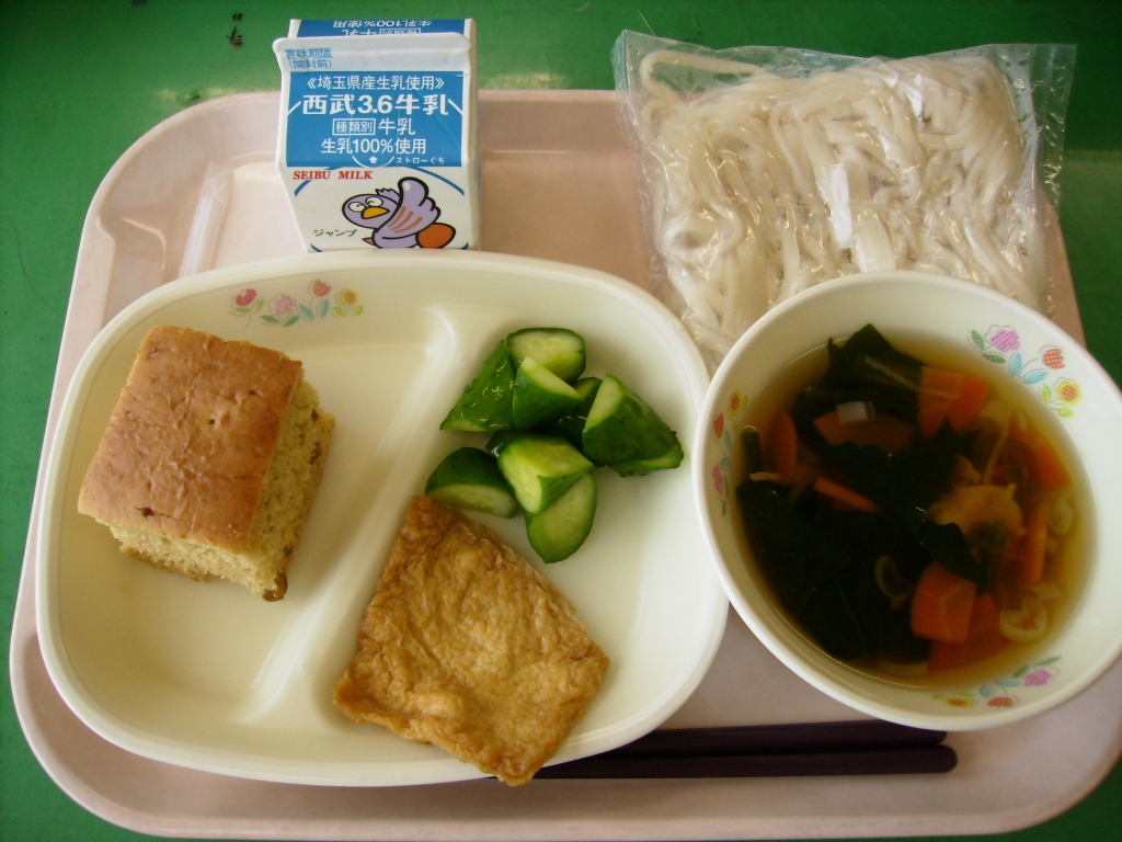 牛乳、きつねうどん(関西風) くるみいり黒糖パンケーキ、塩きゅうり