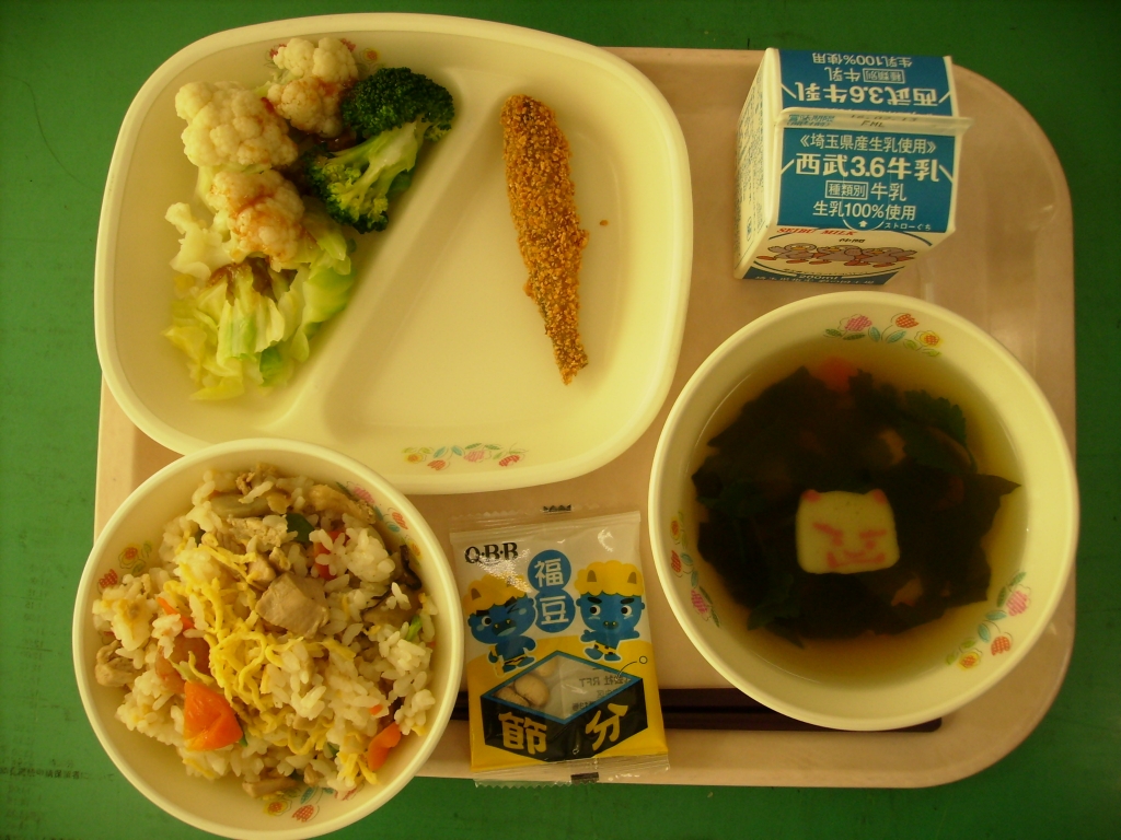 すまし汁には、かわいい鬼のかまぼこが入りました。