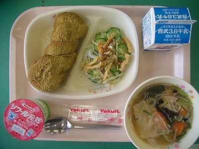 5月15日(火)の給食☆本日の献立☆ 抹茶入りきなこあげパン、パリパリサラダ、ワンタンスープ、ヨーグルト ワンタンスープの、ワンタンが、ちょうど良い柔らかさで、とろとろ、つるつるっと食べられました。ヨーグルトで、最後にさっぱりしました。 |