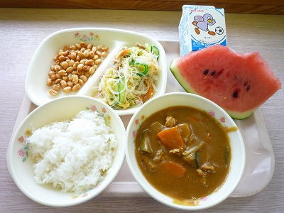 (メニュー) 夏野菜のカレーライス 中華サラダ 大豆のカリカリ揚げ スイカ 牛乳 (食レポ) 学期末を迎え、検食で食べる量が、日に日に多くなってきているのを 実感しています。献立表の上では、719キロカロリーですが、1000近く 食べた感があります。 いつもは10分位で食べ終わりますが、今日は 25分食べ続けていました。なすやピーマンなどが入った夏カレーは 汗をかきながら食べたいです。 1学期の給食は、来週の2回で終了します。 |