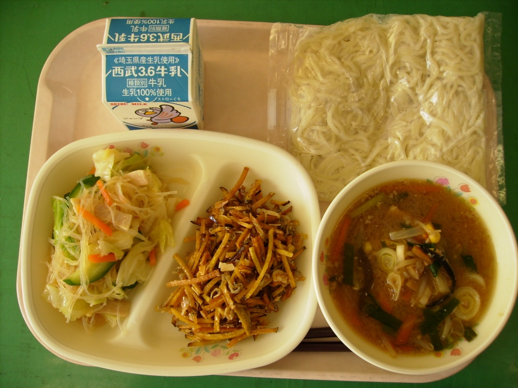 ☆今日の献立☆  牛乳、ごま味噌ラーメン 小魚入り松葉芋 中華サラダ 今日は、松の葉の様な千切りにしたさつまいもを 素揚げし、オーブンでカリカリにしたアーモンド、じゃこを砂糖、 しょうゆ、みりん、はちみつを煮立てて作ったタレで和えました。