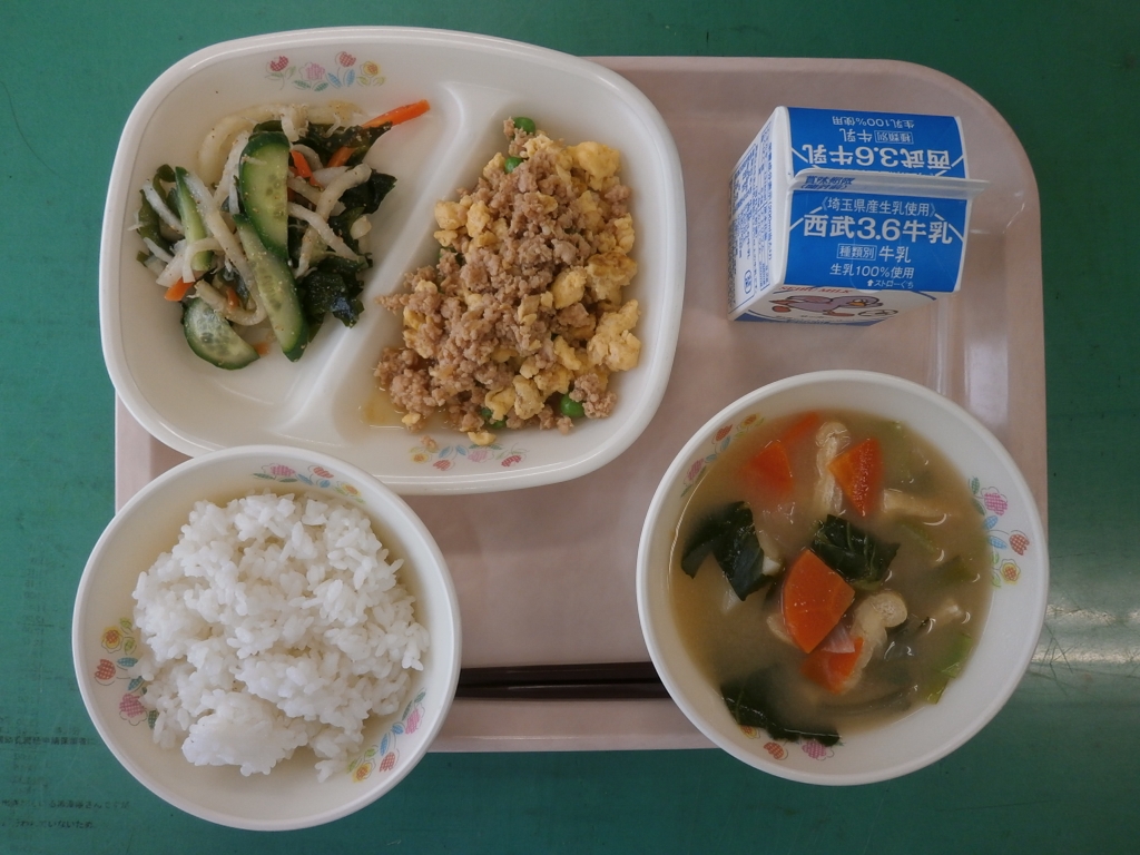 きょうは、そぼろご飯が好評で、ごはん、 そぼろともに残りゼロでした。 サラダも、わかめがつるっとしていて食べやすかったようです。 ごまの香りもこうばしくて良かったです。 みそ汁も、じゃがいもが入り、こちらも好評でした。 今日は、全クラス完食です!! |