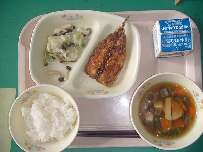 11月8日(木)の給食☆本日の献立☆ ご飯、イワシの蒲焼き、キャベツとキノコのソテー、けんちん汁 イワシの蒲焼きは、カリッと揚がっていて、たれも甘辛く、ご飯のおかずにぴったりでした。ちょっと小骨がありますが、揚げてあるので、そのまま食べられました。 |