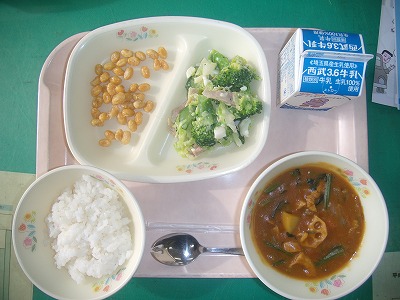 12月7日(金)の給食☆本日の献立☆ ご飯、冬野菜カレー、大豆のカリカリ揚げ、シーザーサラダ 野菜たっぷりの冬野菜カレー。ちょっとからめで、ご飯が進む味でした。シーザーサラダも、野菜たっぷり。ドレッシングの味もちょうどよかったです。 |