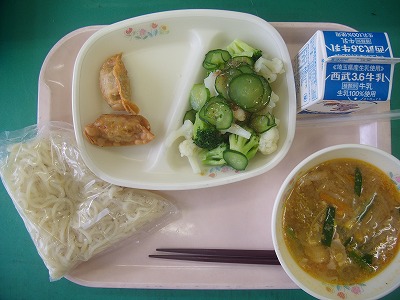 5月26日(金)の給食☆本日の献立☆ 麺、キムチ入り胡麻味噌ラーメンの汁、揚げ餃子、花野菜のサラダ 昨日より今日の方が涼しいですね。温かいラーメンがよりおいしく感じられました。胡麻もたっぷり、野菜もたっぷりで健康にも良さそうなメニューでした。 |