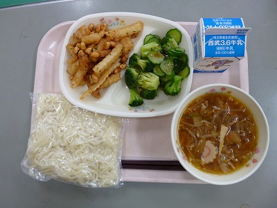 10月13日(金)の給食☆本日の献立☆ 中華麺、サンマーメンの汁、大豆とポテトの揚げ煮、温野菜 教頭「雨で気温が低く、サンマーメンと温野菜のぬくもりが助かりました。おいしかったです。」 |