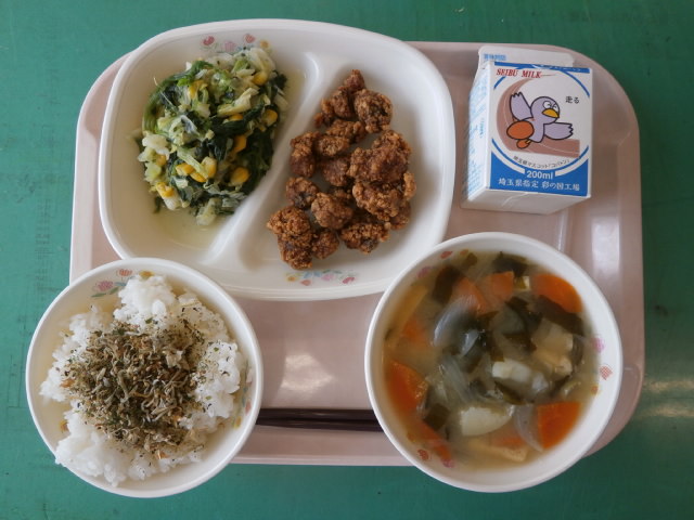 ☆今日の献立☆  牛乳 ごはん・せん茶入り手作りふりかけ じゃがいものみそ汁 かつおの香り揚げ 野菜ソテー 今日も季節のメニューが登場しました。 かつおは初夏に旬を迎える魚です。 しょうが、しょうゆ、酒、カレー粉を下味に かたくり粉をまぶしてかりっと揚げました。 食感がお肉みたいで、魚が苦手な子でもたべられたようです。 残りは1人分くらいでした。 手作りふりかけは、じゃこ、サクラエビ、ごま、青のり、 鰹節、ゆかり、せん茶を煎り混ぜながら作りました。 じゃこ、サクラエビ、ごまでカルシウムアップです。 |